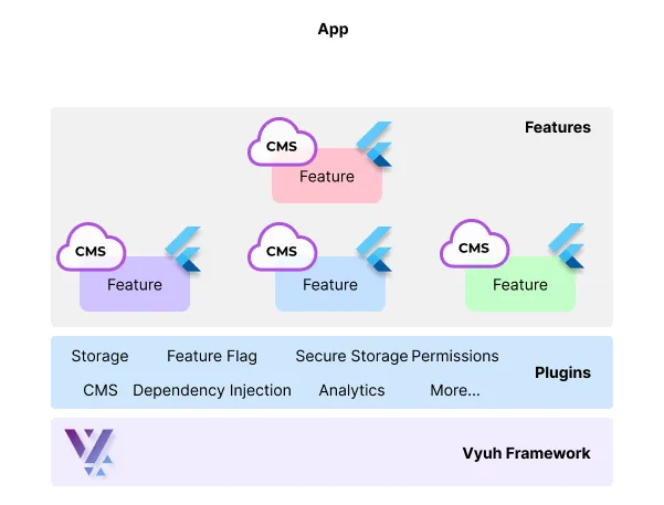 Section titled “Presenting the Vyuh framework”Vyuh is a framework to build modular, scalable Flutter apps driven by a Content Management System (CMS)