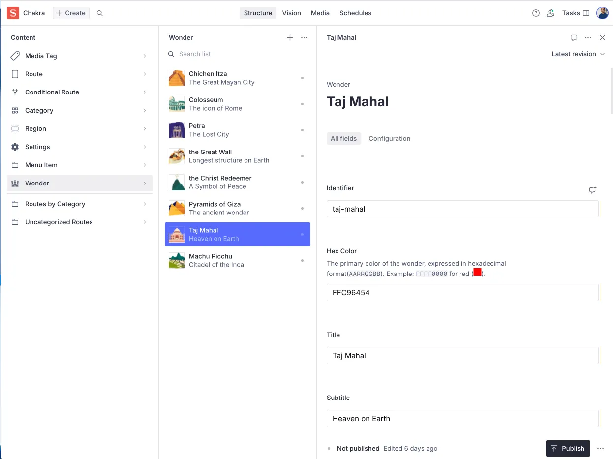 We can easily add more wonders to this list and have them linked up in the CMS and rendered on the App. Publishing more wonders is now just a matter of gathering the visual assets, collecting the facts, putting it all into the wonder document and hitting “Publish” on the CMS.