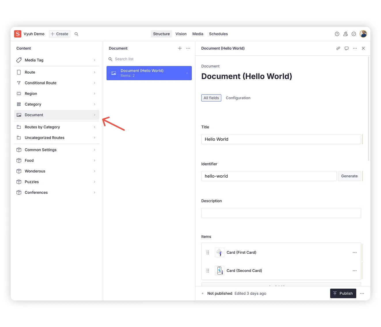 Section titled “Document Schema in Sanity”{ name: 'vyuh.document', type: 'document', title: 'Document', fields: [ { name: 'title', title: 'Title', type: 'string', validation: Rule => Rule.required() }, { name: 'identifier', title: 'Identifier', type: 'slug', validation: Rule => Rule.required(), options: { source: 'title', maxLength: 96 } }, { name: 'description', title: 'Description', type: 'string' }, { name: 'items', title: 'Items', type: 'array', validation: Rule => Rule.min(1), of: [] // Populated with allowed content types } ]}Using the identifier