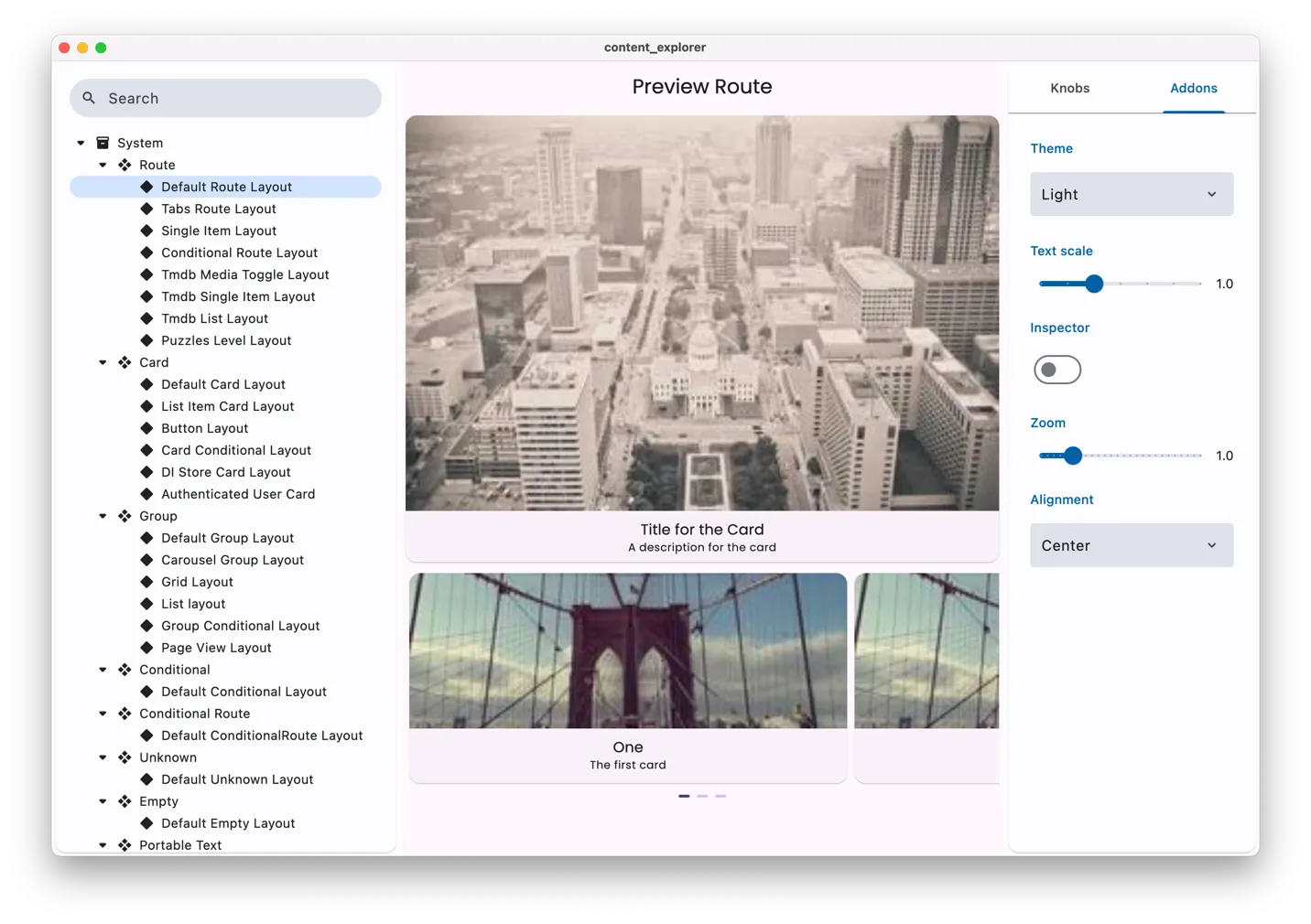 dependencies: vyuh_widgetbook: ^1.0.0Create a new Flutter app for your widgetbook. Here’s an example from our Content Explorer 🔗 app: